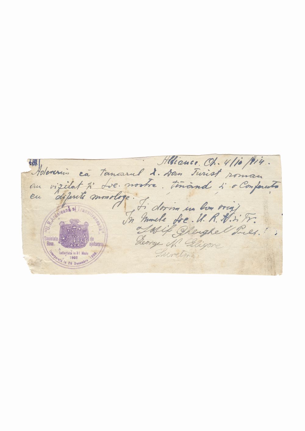 Document privind vizita lui Dumitru Dan la Societatea Romana de Ajutorare U.R. Ardeleana si Transilvaneana, Alliance, Ohio, Statele Unite ale Americii. Dimensiuni: 17,8 x 8,3 cm. Stare de conservare: buna, , hartie usor ingalbenita si patata, necesita restaurare. Material/tehnica: hartie tip dictando, mss, cerneala albastra, stampila rotunda, tus violet, 2 semnaturi).