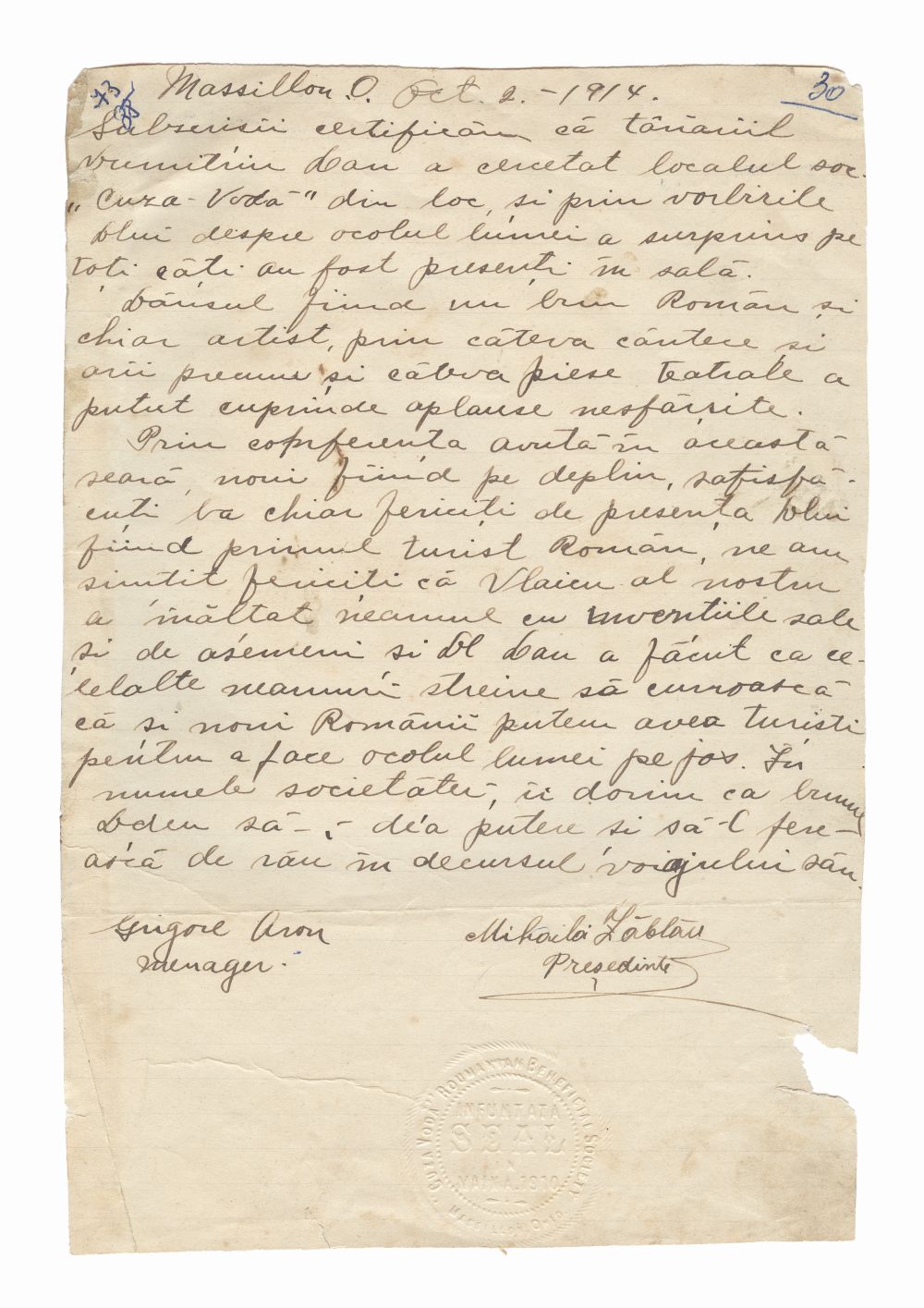 Document privind vizita lui Dumitru Dan la Societatea Romana de Ajutor Cuza Voda, Massillon, Ohio, Statele Unite ale Americii. Dimensiuni: 18,1 x 26,6 cm. Stare de conservare: buna, hartie usor ingalbenita si patata, lipsa material pe latura dr., necesita restaurare. Material/tehnica: sigiliu timbrat, 2 semnaturi, hartie tip dictando, mss, tus negru.