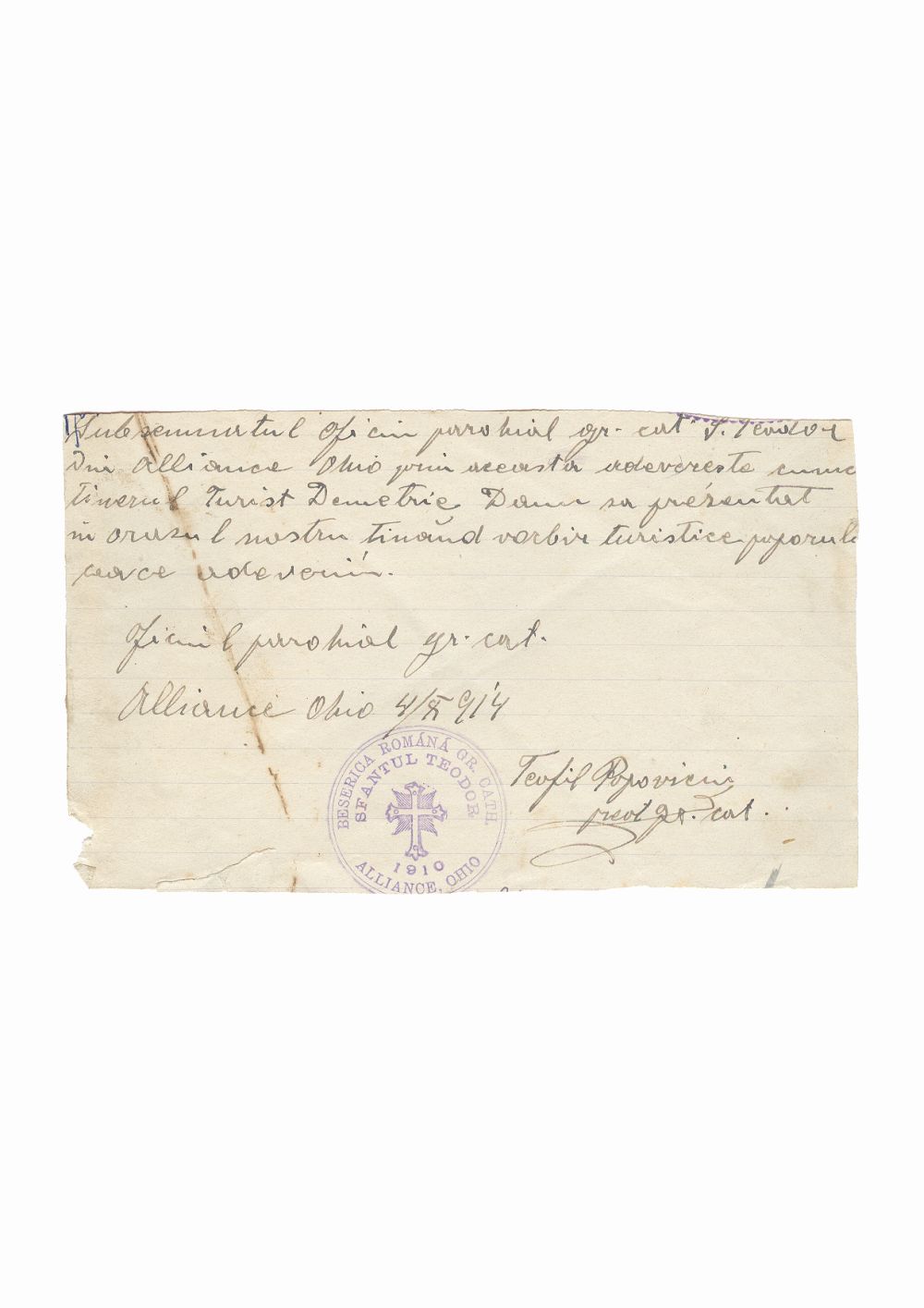 Document privind vizita lui Dumitru Dan la Biserica Romana greco-catolica Sf. Teodor, Alliance, Ohio, Statele Unite ale Americii. Dimensiuni: 17,8 x 11 cm. Stare de conservare: buna, hartie usor ingalbenita si patata, necesita restaurare. Material/tehnica: hartie tip dictando, mss, tus negru, stampila rotunda - tus violet, semnatura.