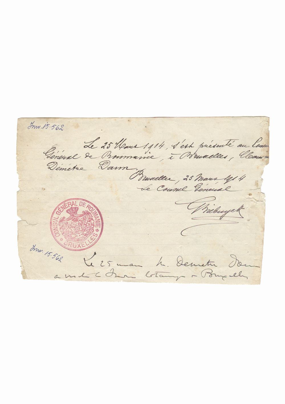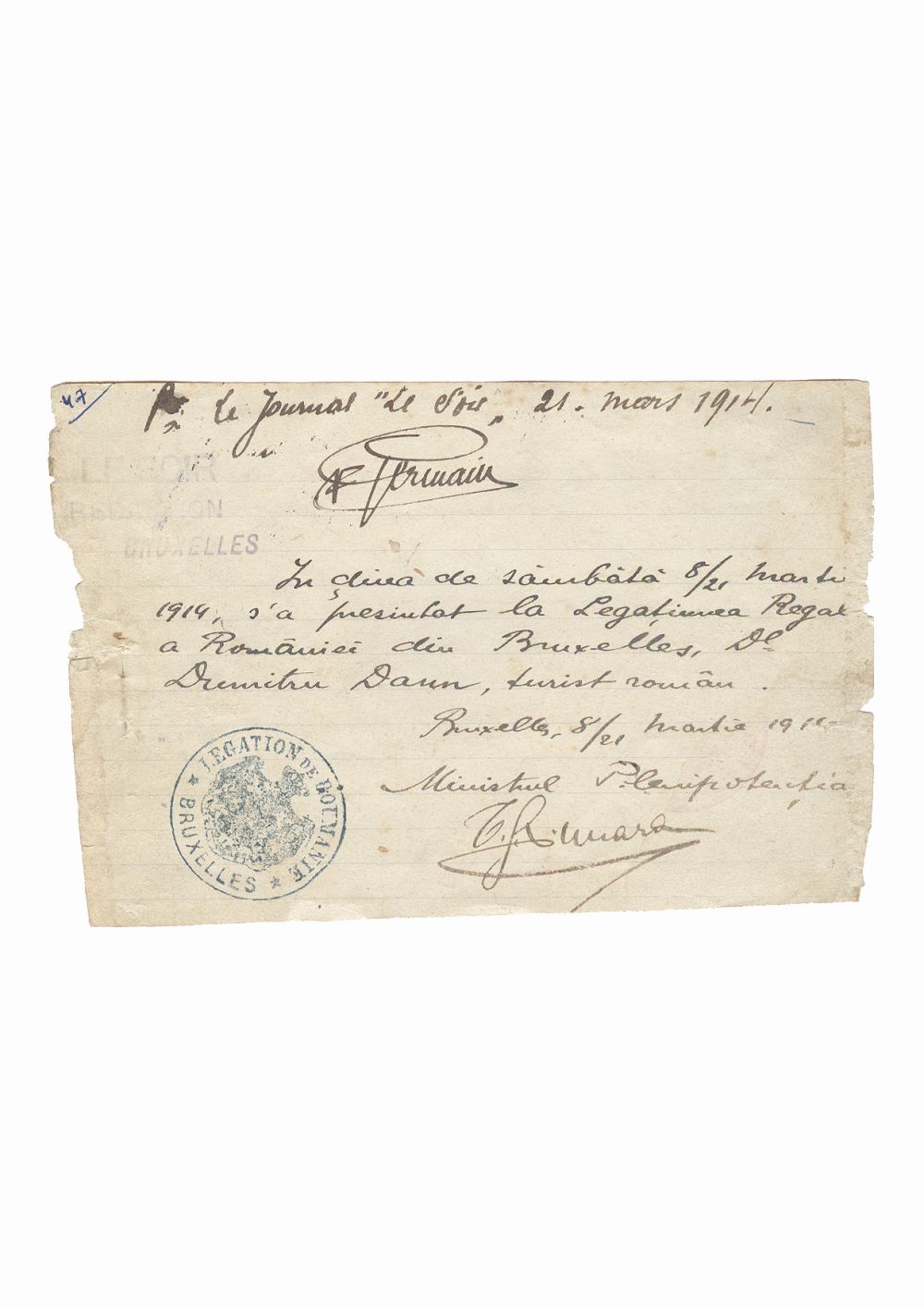Document privind vizita lui Dumitru Dan la Legatia Regala a Romaniei din Bruxelles, la Consulatul General al Romaniei la Bruxelles si la redactia ziarului "Le Soir" Belgia; semneaza ministrul plenipotentiar Trandafir G. Djuvara. Dimensiuni: 18,5 x 11,8 cm. Stare de conservare: buna, hartie usor ingalbenita si patata, mici rupturi. Material/tehnica: hartie tip dictando, mss, tus negru, 3 semnaturi, 2 stampile rotunde, tus verde si rosu.