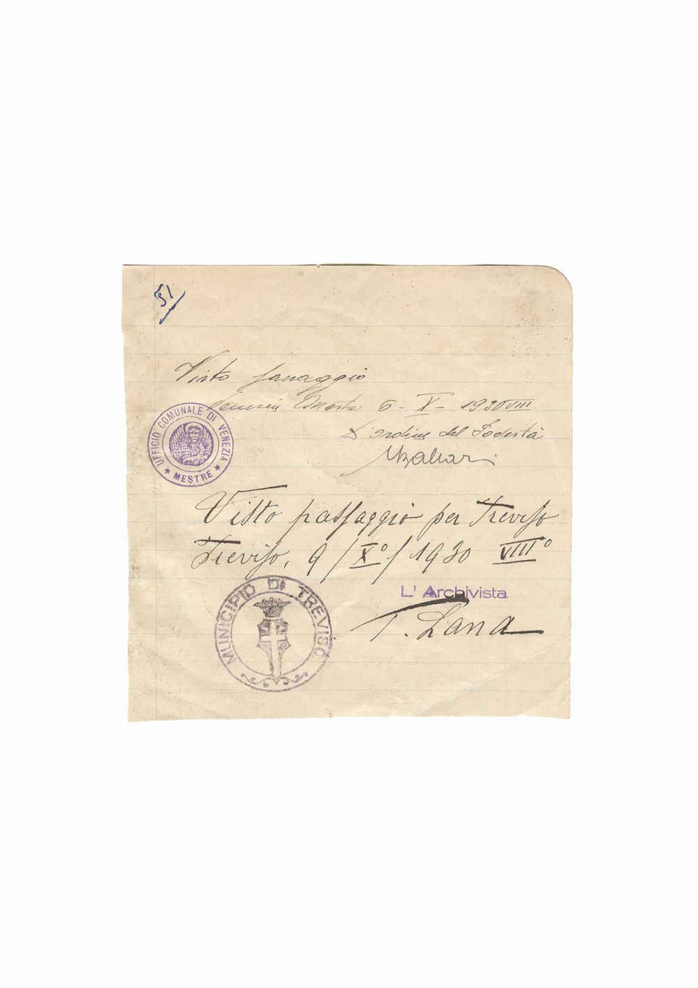 Document privind vizita lui Dumitru Dan la Primariile din Treviso, Mestre, provincia Venetia, Italia; i-a apartinut lui Dumitru Dan. Dimensiuni: 13,4 x13,6 cm. Stare de conservare: buna, hartie usor ingalbenita. Material/tehnica: hartie tip dictando, mss, tus negru, 2 semnaturi, 2 stampile rotunde, tus negru si violet.